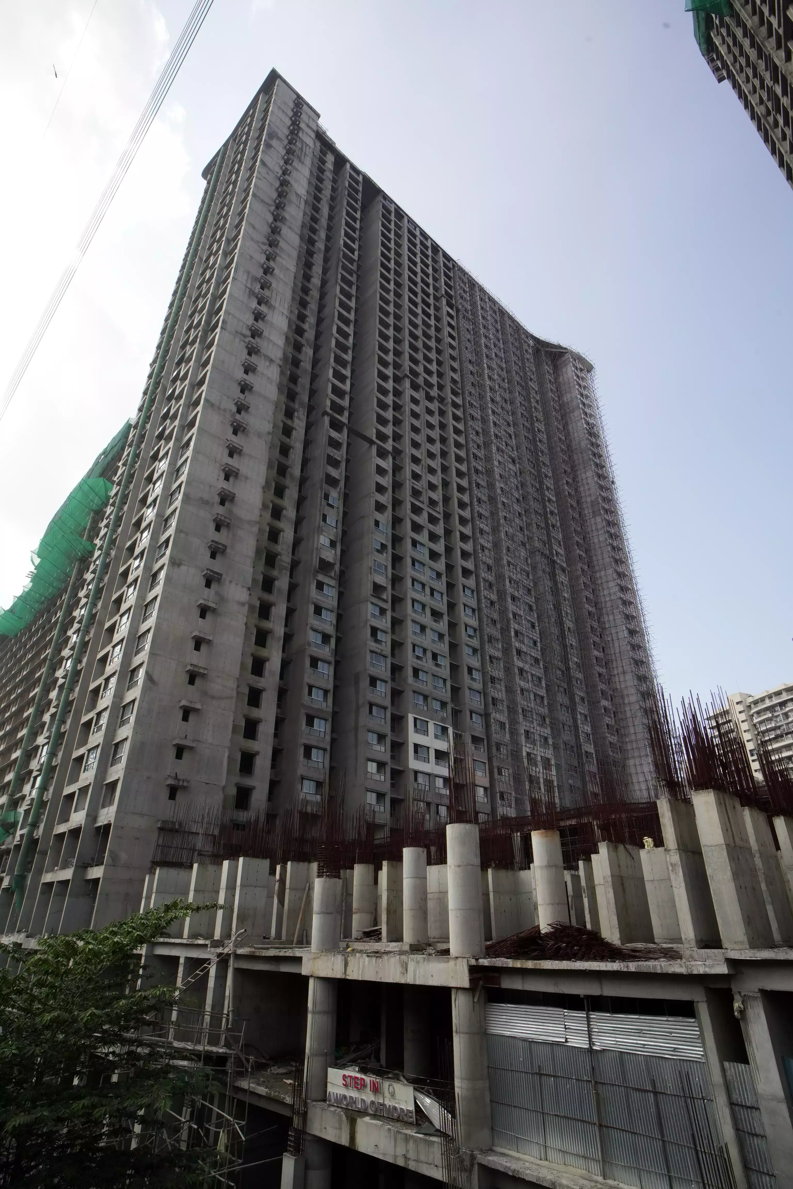 Tower 1A: Tiling and flooring, electrical fittings, plumbing work, and lift installation are in progress. Bamboo scaffolding is also being fixed for external painting.